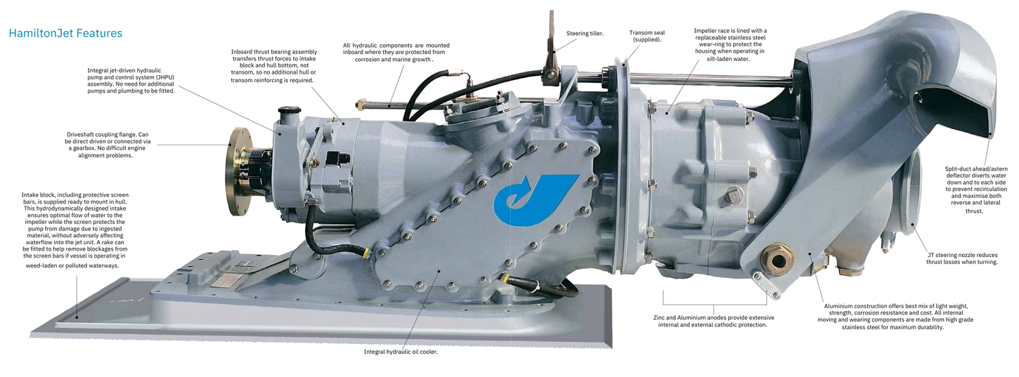 The HamiltonJet waterjet has a high efficiency astern thrust with “power-braking” ability at speed.